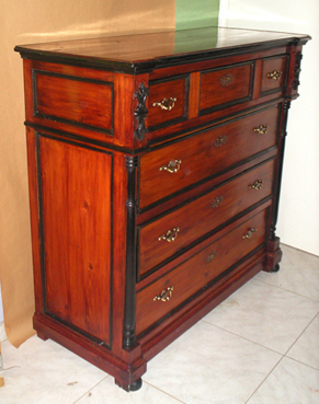 Aquí podemos ver un ejemplo de trabajo con lacado. Una cómoda de madera antes y después del tratamiento. Se ha retirado la pintura, consolidado el soporte y se ha teñido de caoba con detalles ebanizados. El acabado se ha realizado con goma laca descerada con muñequilla.